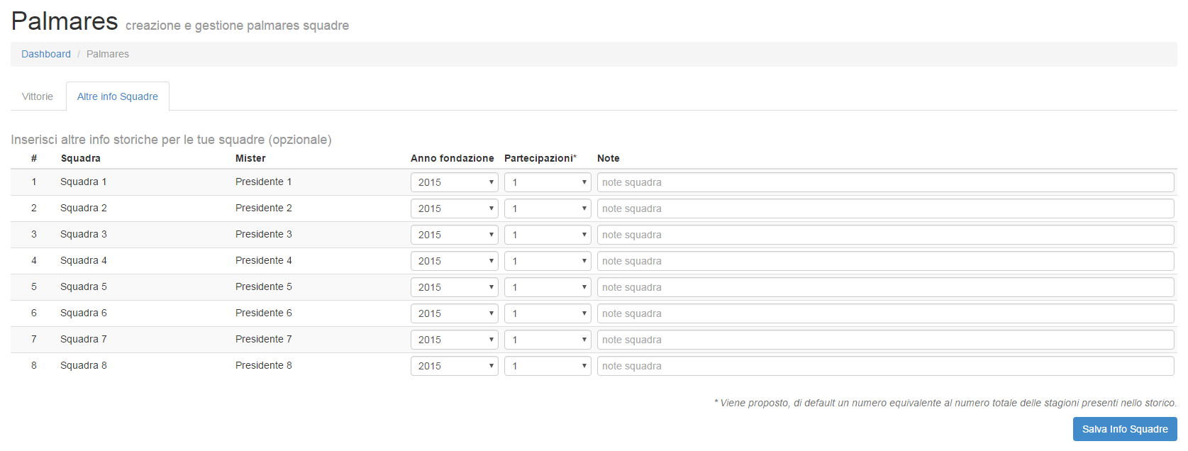 Inoltre, per ogni singola squadra puoi aggiungere alcune info storiche quali Anno di Fondazione, N° di Partecipazioni in Lega e Note.