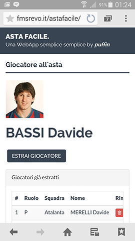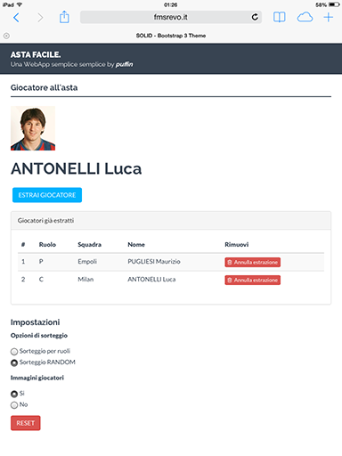 Asta Facile è una web app utilizzabile in fase di asta per l’estrazione a sorte dei calciatori, presi dall’archivio di riferimento; di norma Serie A o eventi come Mondiali o campionati Europei.