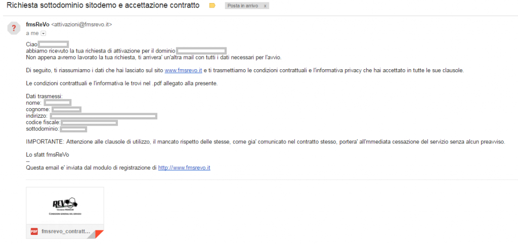 – nella prima troverai il recap dei dati trasmessi, ed in allegato troverai un .pdf con le condizioni contrattuali e l’informativa