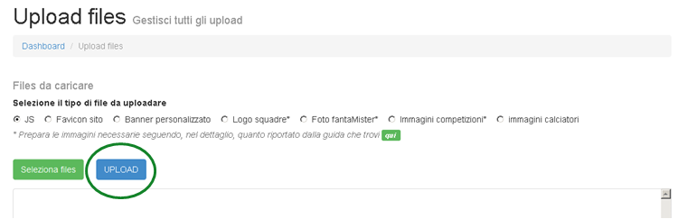 Avrai la possibilità di selezionare il tipo di file da caricare, di selezionarli e di trasferirli (tasto UPLOAD).
