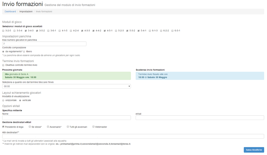 Da questa sezione del pannello di amministrazione è possibile gestire tutte le configurazioni del Modulo di Invio Formazioni (moduli di gioco, impostazioni panchina, termine di invio formazioni, etc…):