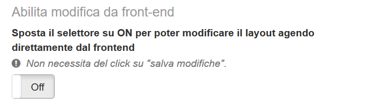 Al termine delle modifiche salverete il layout direttamente dalla Home Page e, tornati in questa pagina, potrete disabilitare le modifiche da front-end (di nuovo SENZA salvare le modifiche nella pagina).