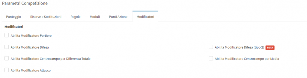 - Portieri (si attribuisce a tutti i portieri che ottengono un voto superiore al 6, a patto che non abbiano parato rigori, è possibile selezionare se applicarlo o meno in caso il portiere abbia parato rigori ed è anche possibile specificare se attribuirlo alla propria squadra o, come penalità, all’avversario)
