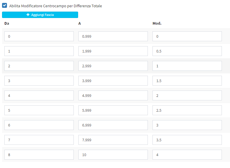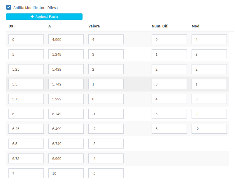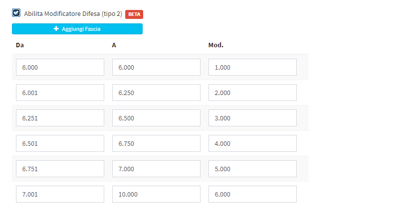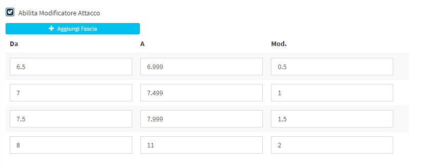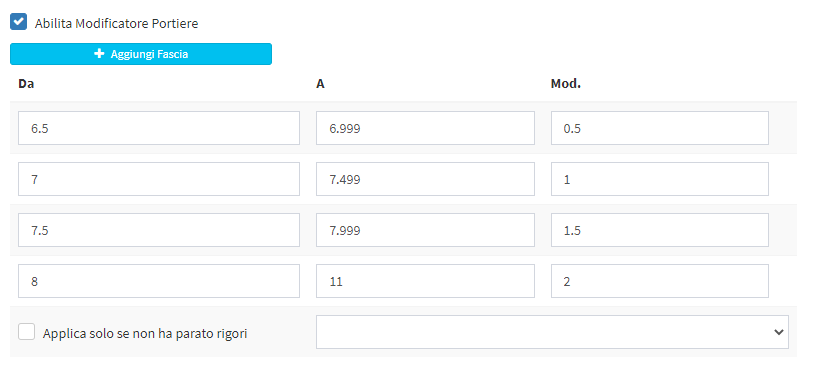 Per ogni modificatore viene proposto un numero minimo di fascie/soglie: è possibile aggiungerne a piacimento tramite l’apposito bottone “Aggiungi Fascia” presente per ogni tipologia.