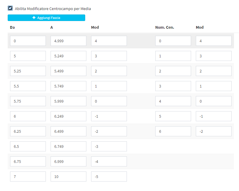 - Centrocampo per media (alternativo al precedente è dato dalla media voto dei centrocampisti schierati in formazione, calcolata sulla base del solo voto in pagella, o della media voto, assegnato a ciascun centrocampisti . In nessun caso per il calcolo del modificatore del centrocampo devono essere presi in considerazione i punti bonus/malus)
