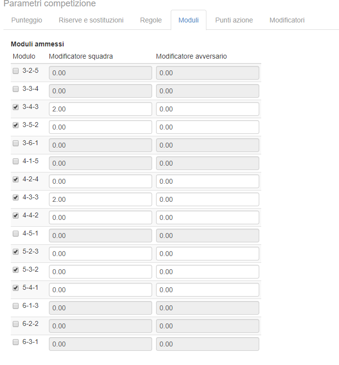 E’ possibile anche inserire dei modificatori di modulo: bonus per la propria squadra e malus per la squadra avversaria.
