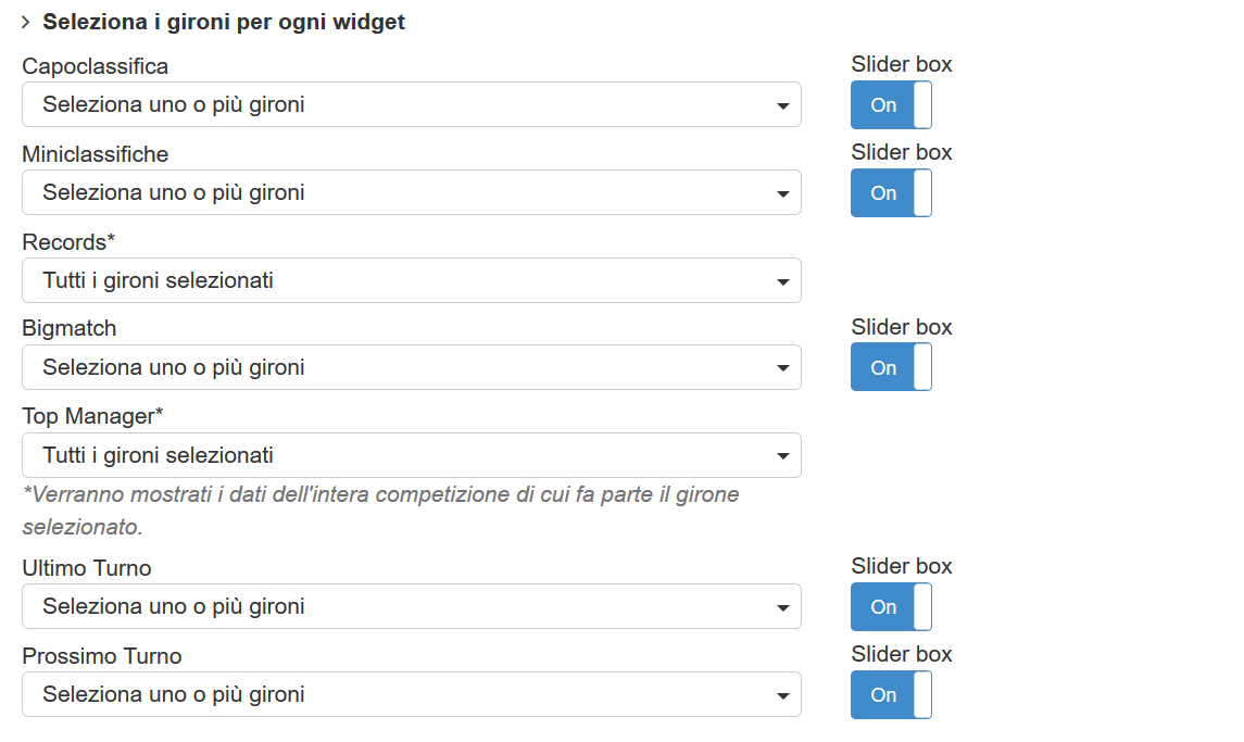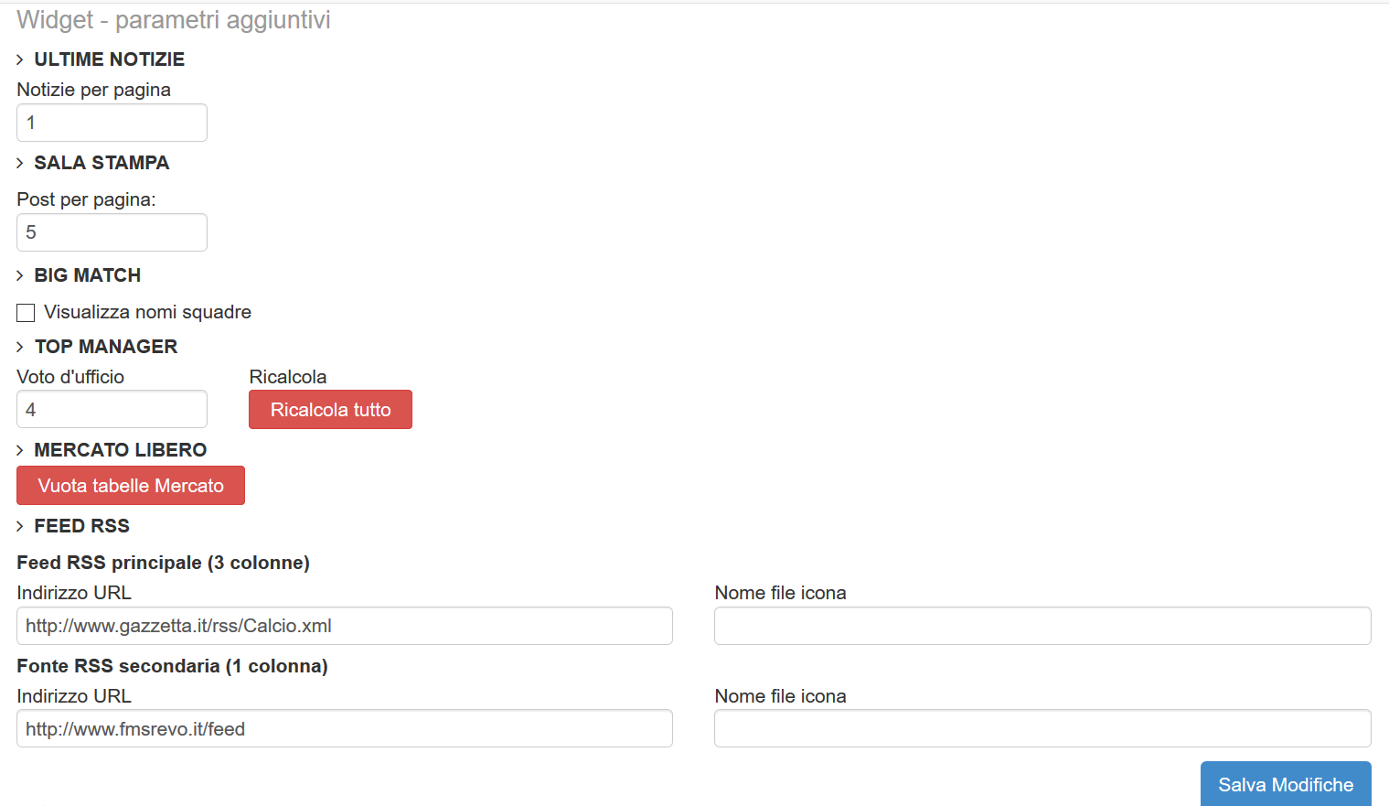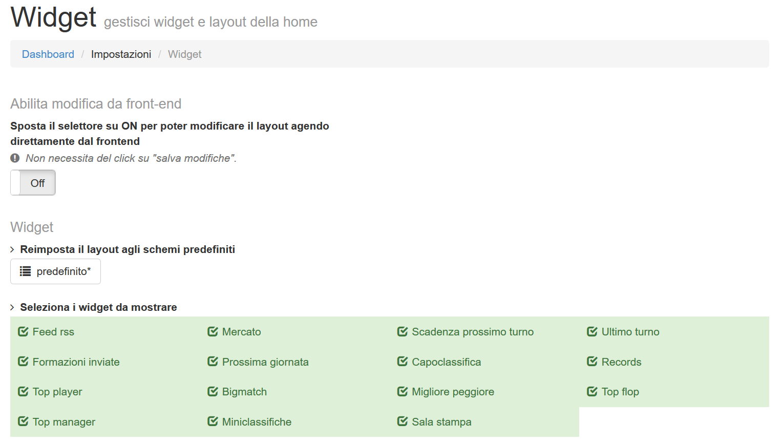 Dalla pagina Widget è possibile gestire tutti i Widget di fmsReVo ed il layout dell’Home Page.